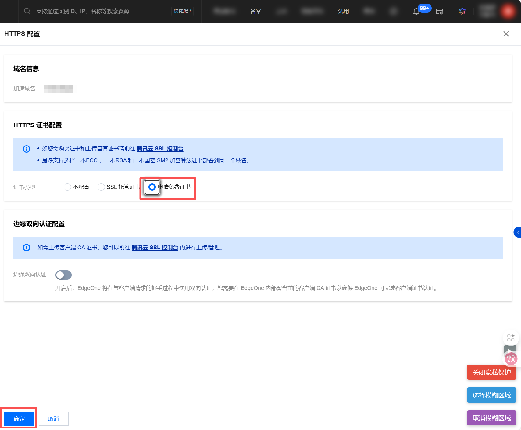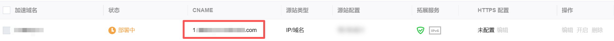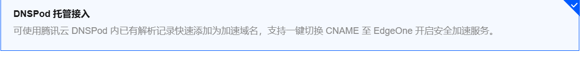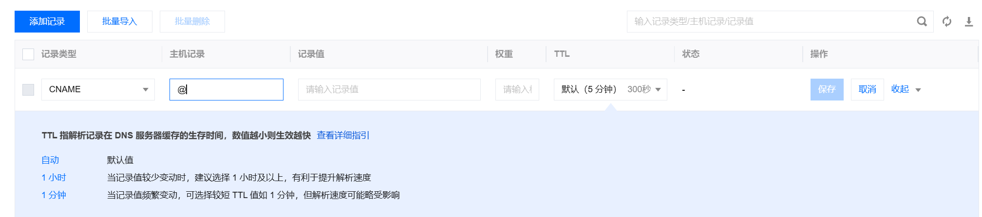 进入DNSPod选择所购买的域名,暂停之前的A解析,将所给的CNAME加入解析中,记录类型选择CNAME,主机记录填写@,记录值为edgeone所给的,点击确定