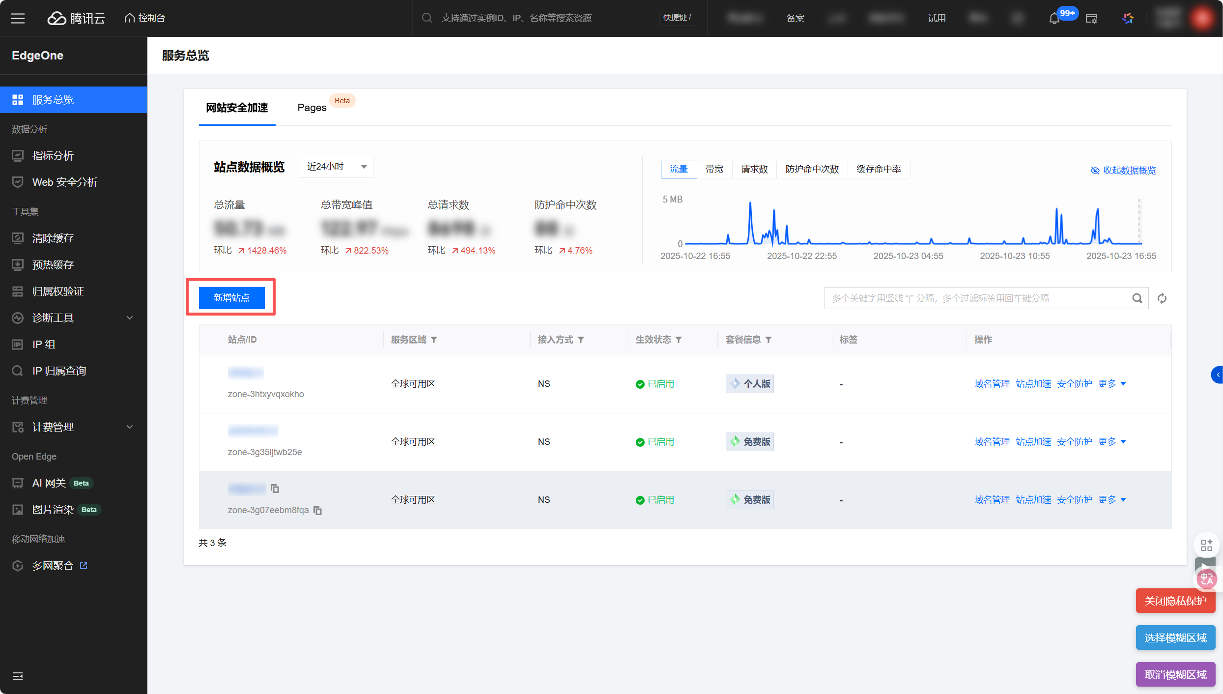 点击新增站点,输入自己的域名,选择接入方式为DNSPod托管接入,地区为中国大陆区