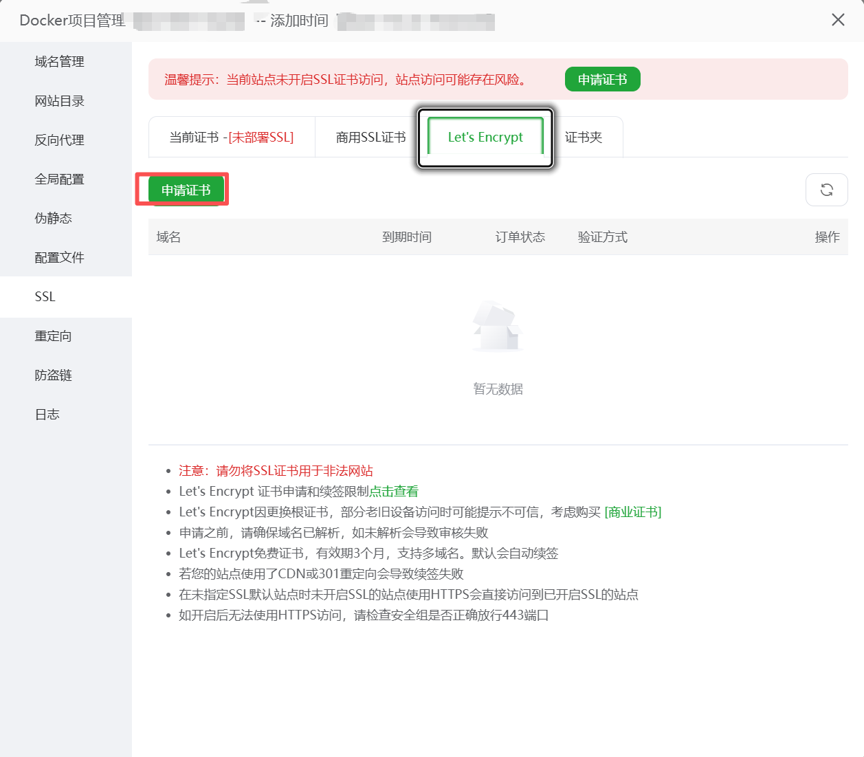 点击未部署—点击Let‘s Encrypt申请一张免费证书