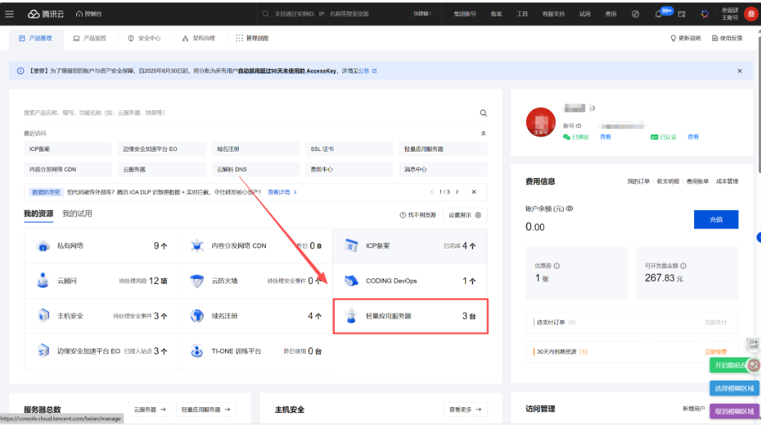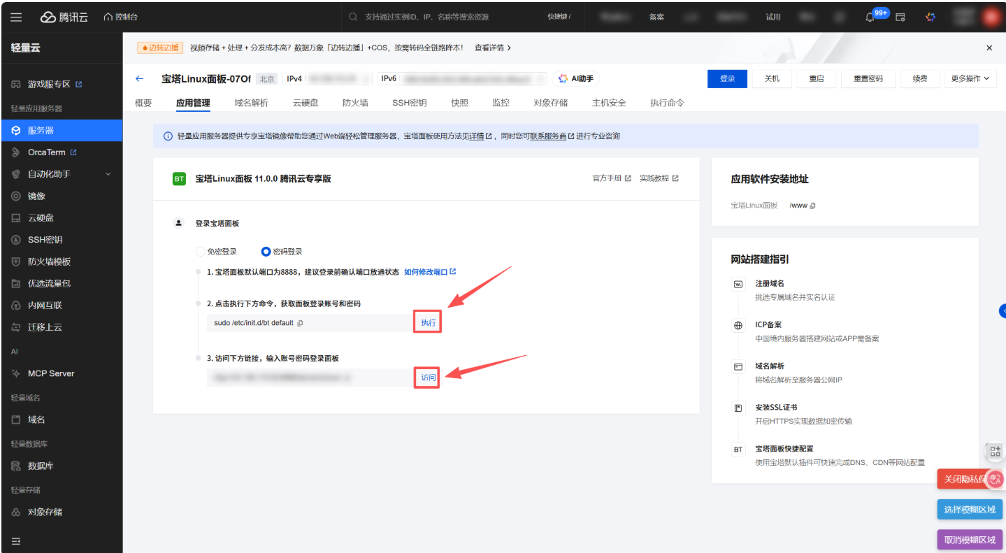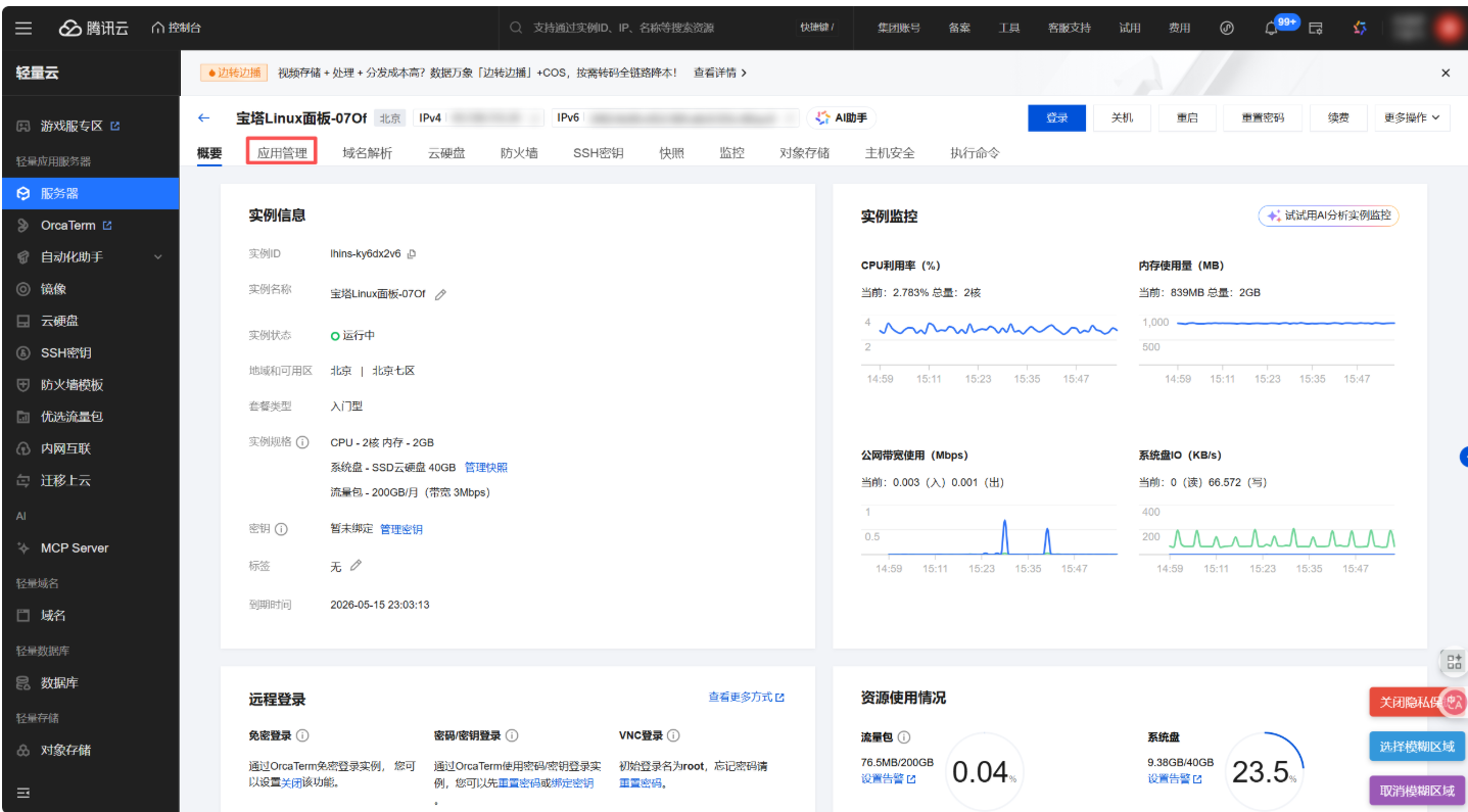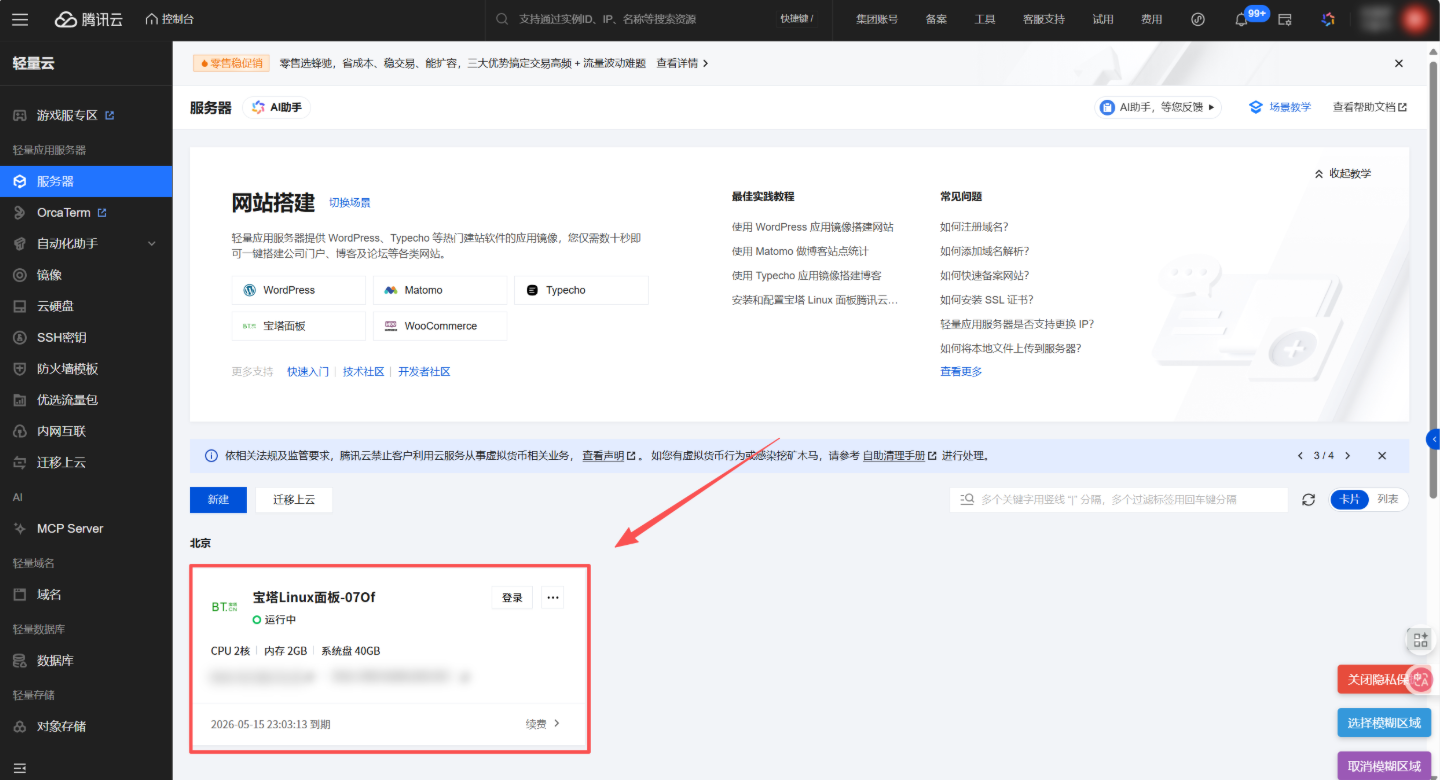 付款完成后就可以在控制台看到购买的轻量服务器了