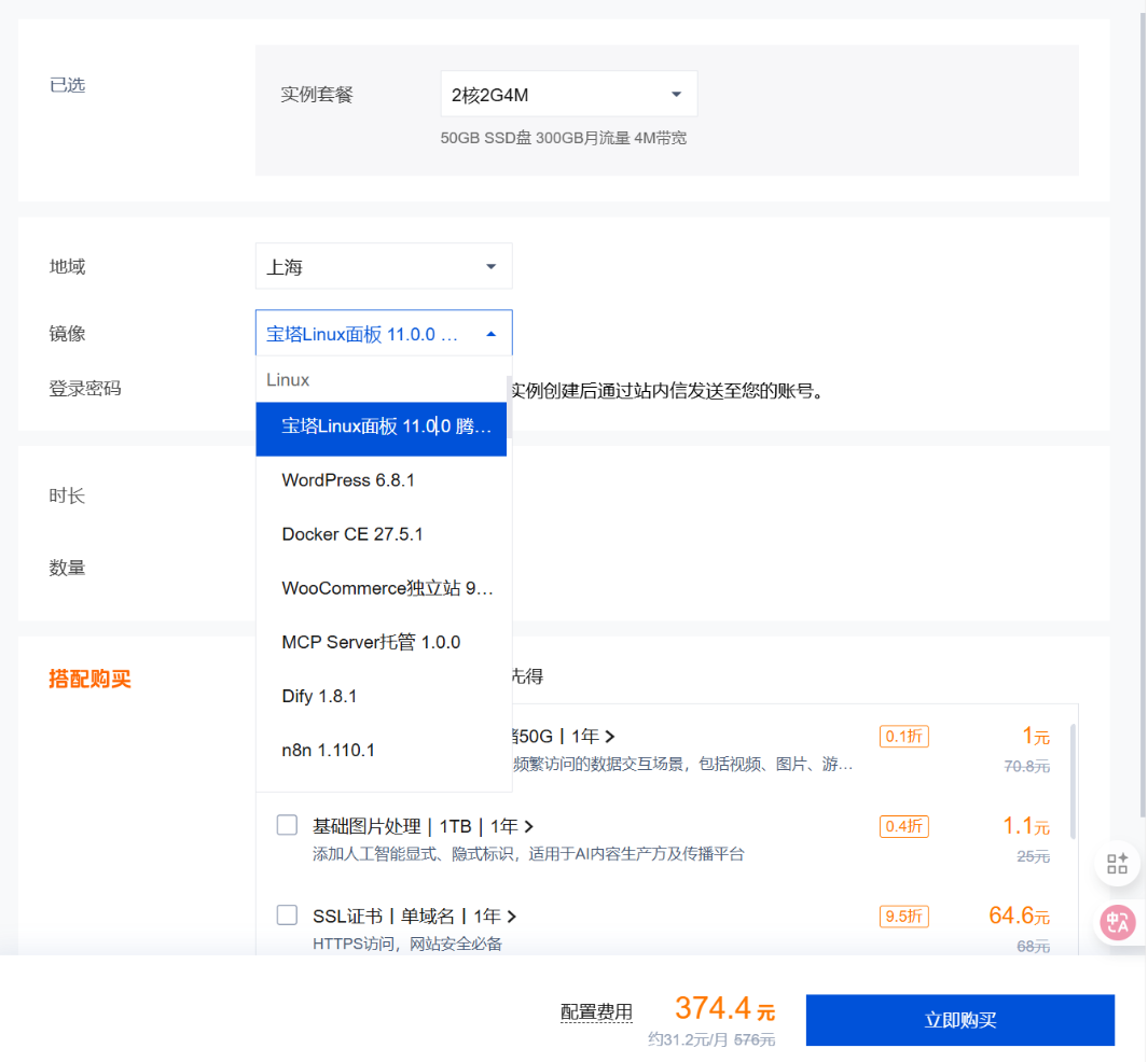 输入想购买的域名,购买后在域名和外部访问地址填入自己的域名(域名必须指向A解析才可以使用域名访问)